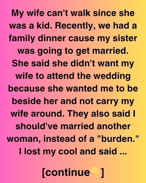 “My wife hasn’t been able to walk since childhood. Recently, we had a family dinner to celebrate my sister’s upcoming wedding. It was supposed to be a joyful evening, full of laughter and excitement as we planned for the big day. The table was set beautifully, with candles flickering in the center and the smell of roasted chicken and garlic bread filling the air. Everyone was chatting, clinking glasses, and sharing stories. My wife sat beside me in her wheelchair, smiling warmly, doing her best to feel included even though I could sense her usual quiet hesitation around my family. She has always been gentle and patient, never wanting to be a source of tension, even when comments were made that cut deeper than people realized.