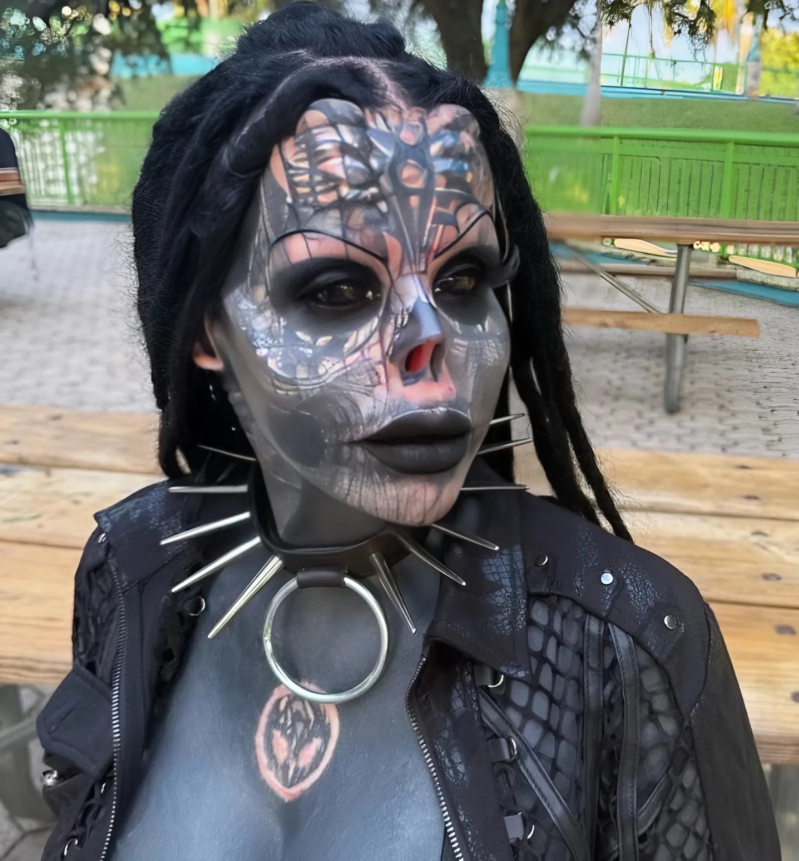 In a bold and deeply controversial decision, she surgically removed her nose. Entirely. What remains is a smooth, open cavity — a haunting and dramatic departure from human anatomy. Alongside that, she had her tongue split in two, giving it a snake-like fork. Her eyes, now an eerie shade of bluish gray, are the result of tattooing the sclera — an extremely risky procedure that changes the color of the whites of the eyes.