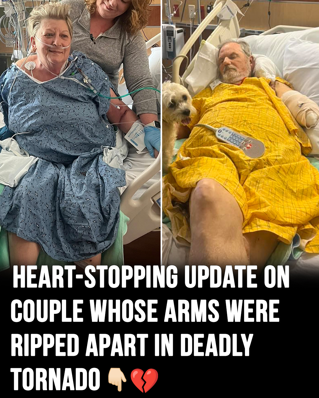 Among the survivors were Paul and Gail Cline, who had lived in their home for decades. When the tornado hit, they did what came naturally—they reached for one another. As their house began to crumble and the roar of the storm grew deafening, the two held each other tightly, determined not to let go. In those final moments before the collapse, their bond was their anchor. When the winds tore through and the walls gave way, they lost their home and each lost an arm. The very embrace that had bound them together also became the sacrifice that saved their lives.