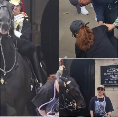 A tourist has gone viral online after a video captured her sustaining a pretty nasty injury when she got a little too close to a King’s Guard horse…